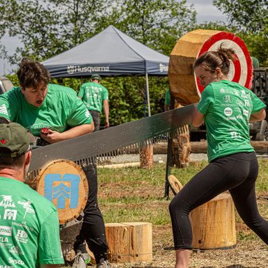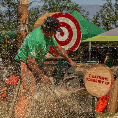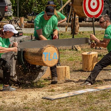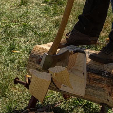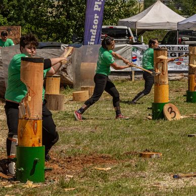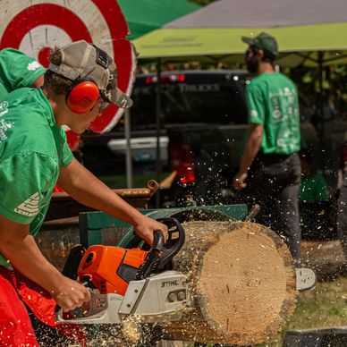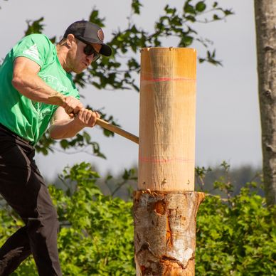 A discipline based on old-time loggers need to establish a cutting platform above the root bases of old growth trees, competitors uses an axe to chop pockets into a 9’ pole and places springboard platforms into the pockets. Climbing on the springboards, the competitor chops through an 11” diameter white pine log at the top of the pole.