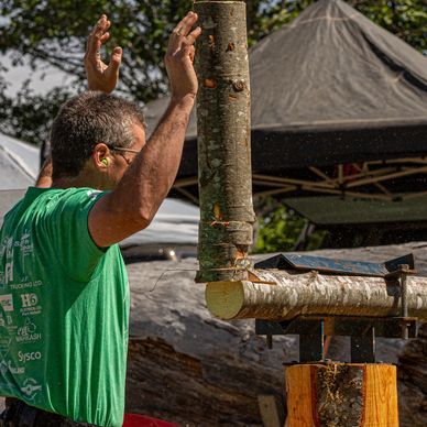 Competitors stand to a block that is standing vertically, simulating cutting down a tree. They must chop the block in half from both sides.