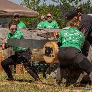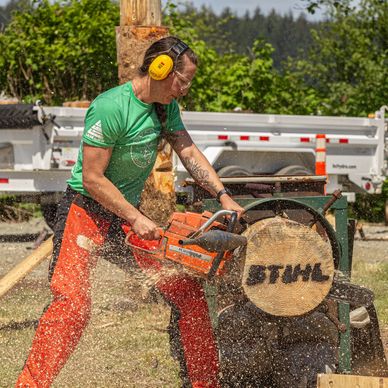 Saws supplied. Contestants start with hands on top of the log, saw idling and chain brake dis-engaged. At “go”, contestant must make a down cut which results in one complete disc. Time stops when the disc is severed. The contestant must pass the disc through a 1 ½” gate to determine if their cut is legal. Ladies have saw idling, men have saw shut off.