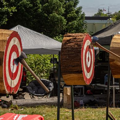 Contestant throws an axe at the target from 20 feet back. Only the leading edge of the axe can stick in the target for a score. Contestant takes 1 practice throw and then 3 throws that count for points. Bulls-eye scores 5 points, each ring out from center scores one less.